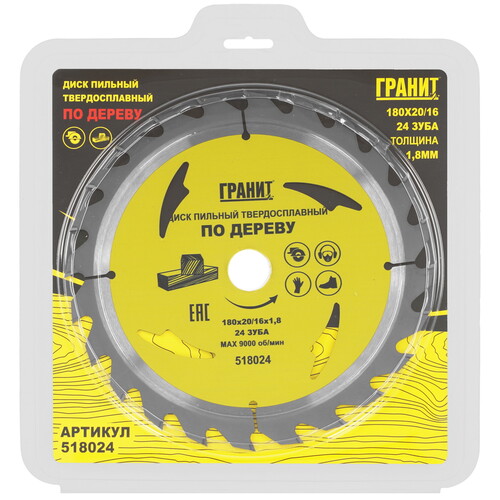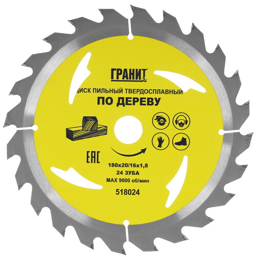 Диск пильный ГРАНИТ 518024 с 24 зубьями используется в качестве оснащения дисковых, торцовочных и торцовочно-комбинированных пил. Изделие из твердого сплава предназначено для пиления древесины. Износостойкость и режущие свойства инструмента улучшают напайки.