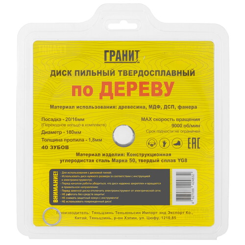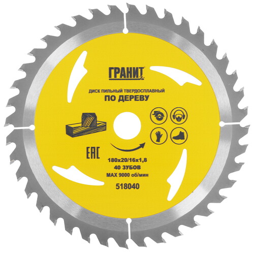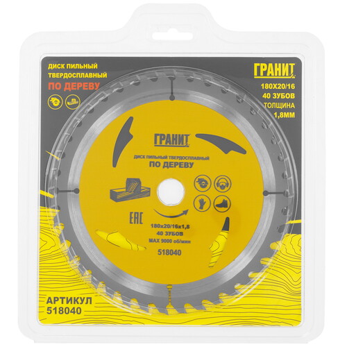 Диск пильный ГРАНИТ 518040 позиционируется как насадка для дисковой или торцовочной электропилы и позволяет пилить дерево, ДСП, ДВП, ламинат, фанеру. Насадка с внешним диаметром 180 мм и диаметром посадочного отверстия 16-20 мм имеет основу из углеродистой стали с твердосплавными зубьями в количестве 40 шт., которые позволяют создавать быстрые пропилы в обрабатываемых материалах.