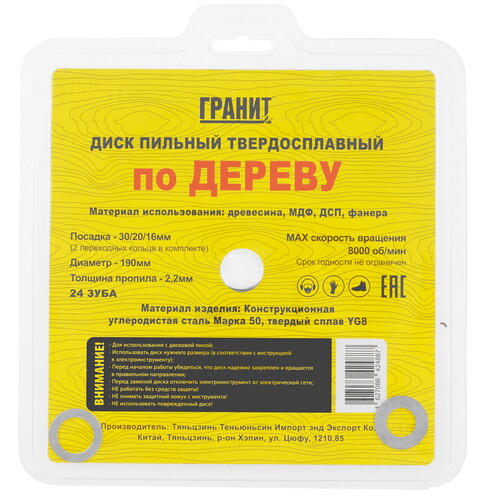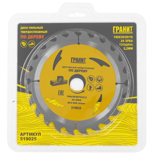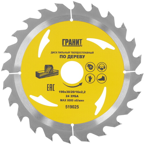 Диск пильный ГРАНИТ 519025 позиционируется как насадка для дисковой или торцовочной электропилы и позволяет пилить дерево, ДСП, ДВП, ламинат, фанеру. Насадка с внешним диаметром 190 мм и диаметром посадочного отверстия 16-30 мм имеет основу из углеродистой стали с твердосплавными зубьями в количестве 24 шт., которые позволяют создавать быстрые пропилы в обрабатываемых материалах.