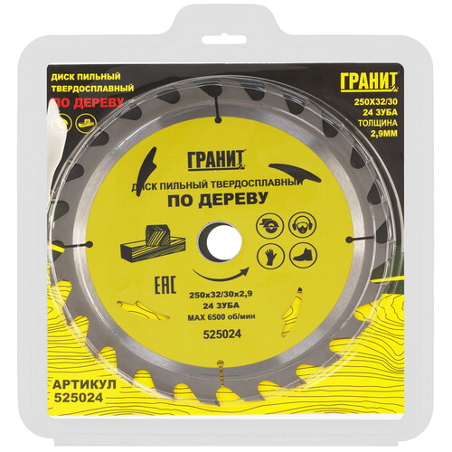 Диск пильный ГРАНИТ 525024 устанавливается с использованием посадочных диаметров 30 и 32 мм. Наружный размер инструмента – 250 мм. Диск рассчитан на частоту вращения до 6500 об/мин. Толщина изделия – 2.9 мм. Рез производится без водяного охлаждения.