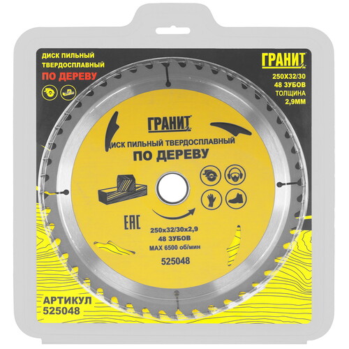 Диск пильный ГРАНИТ 525048 устанавливается с использованием посадочных диаметров 30 и 32 мм. Наружный размер инструмента – 250 мм. Диск рассчитан на частоту вращения до 6500 об/мин. Толщина изделия – 2.9 мм. Рез производится без водяного охлаждения.