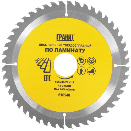 Диск пильный ГРАНИТ 616548 позиционируется как насадка для дисковой или торцовочной электропилы и позволяет пилить ламинат, фанеру. Насадка с внешним диаметром 165 мм и диаметром посадочного отверстия 20-30 мм имеет основу из углеродистой стали с твердосплавными зубьями в количестве 40 шт., которые позволяют создавать быстрые пропилы в обрабатываемых материалах.
