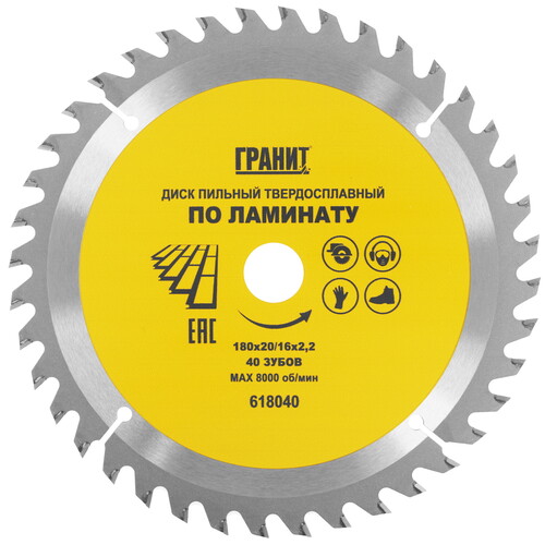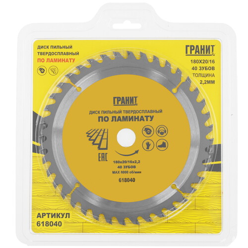Диск пильный ГРАНИТ 618040 позиционируется как насадка для дисковой или торцовочной электропилы и позволяет пилить ламинат, фанеру. Насадка с внешним диаметром 180 мм и диаметром посадочного отверстия 16-20 мм имеет основу из углеродистой стали. Она оснащается твердосплавными зубьями в количестве 40 шт., которые позволяют создавать быстрые пропилы в обрабатываемых материалах.