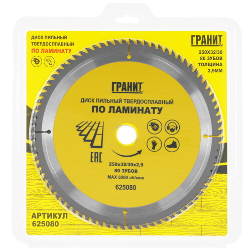 Диск пильный ГРАНИТ 625080 предназначен для пиления ламината. Изделие с 80 зубьями применяется при оснащении дисковых, торцовочных и торцовочно-комбинированных пил. Посадочные диаметры диска – 30 и 32 мм. Внешний диаметр инструмента равен 250 мм, а толщина составляет 2.9 мм. Оснащение рассчитано на частоту вращения не выше 6000 об/мин.