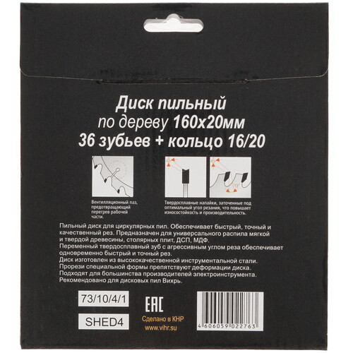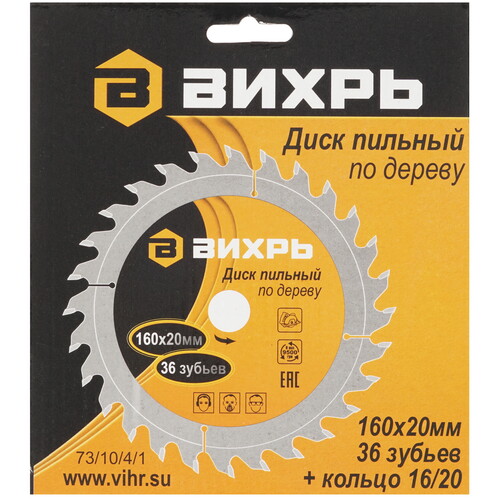 Диск пильный Вихрь 73/10/4/1 предназначен для разрезания изделий из твердых и мягких сортов древесины. Изделие оснащено 36-ю острыми зубьями, расположенными под небольшим уклоном. Такая конструкция способствует эффективному продольному и поперечному разрезанию материалов.