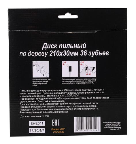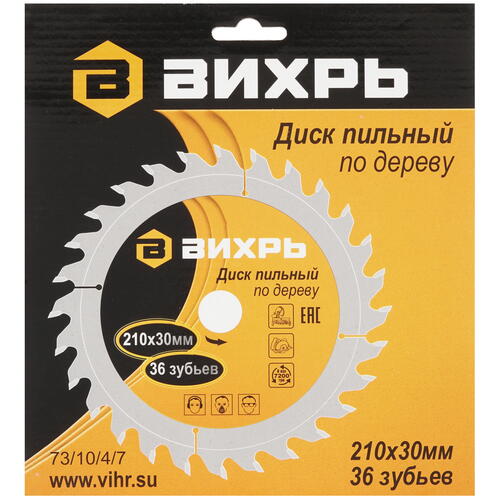 Диск пильный Вихрь 73/10/4/7 оснащен 36 режущими зубцами с алмазной заточкой и твердосплавными напайками на рабочей кромке, что вместе с нестандартной геометрией и агрессивным углом заточки способствует качественному и эффективному распилу различных типов древесины, а также изделий на ее основе — например, ламината, клееного дерева или фанеры. Максимальная скорость вращения режущего полотна может достигать 7200 об/мин, что позволяет работать даже с самыми твердыми породами дерева. Во избежание повреждений при интенсивной работе для изготовления пильного диска используется высококачественная инструментальная сталь, что вкупе со специальными прорезями в полотне, препятствующими перегреву и деформации, обеспечивает длительный срок эксплуатации инструмента.