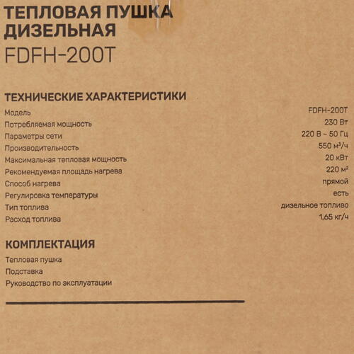 Тепловая пушка дизельная FinePower FDFH-200T предназначена для обогрева промышленных помещений. Она обладает мощностью 20 кВт и функционирует на основе дизельного топлива с расходом 1.65 кг/ч. Встроенный терморегулятор контролирует нагрев и автоматически отключает прибор при достижении заданной температуры.