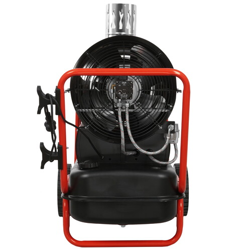 2000 м³/ч, обогрев - 82 кВт, расход топлива - 7.6 кг/ч, непрямой нагрев, регулировка температуры, колёса, вес - 59 кг