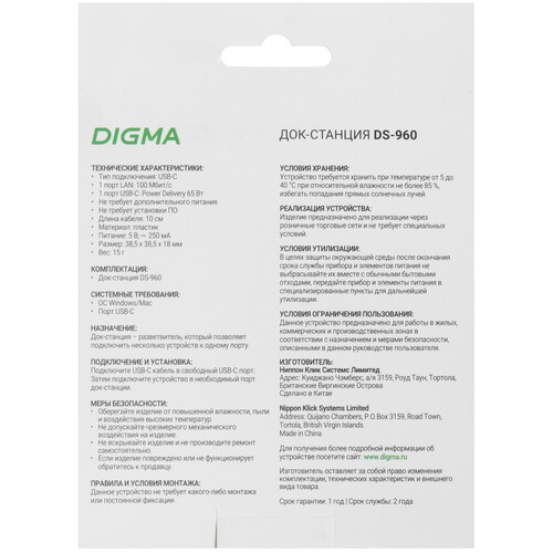 Digma DS-960 - док-станция предназначена для подключения ПК и других устройств к проводной сети Интернет. Поддержка PD 65W.