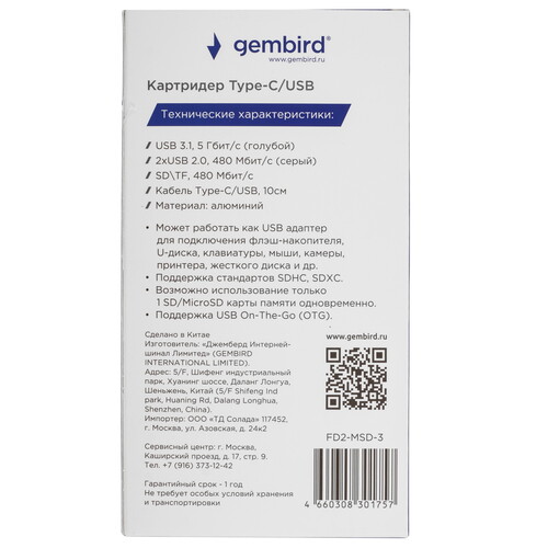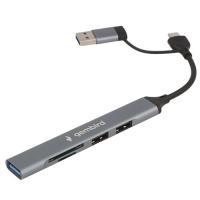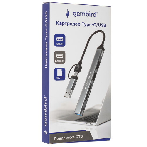 USB 2.0 Type-A х 2, кард-ридер SD, кабель - 10 см, OTG, корпус серый