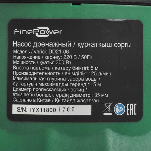 Основой Finepower DD21-06 является производительный центробежный механизм мощностью 300 Вт, который способен прокачивать до 125 литров жидкости в минуту. Кроме того, модель отличается напором вплоть до 5 м. Отличительной особенностью насоса также является некоторая универсальность, благодаря которой он может использоваться для откачивания не только чистой, но и загрязненной воды с диаметром твердых частиц (например, песка или камней) до 35 мм. Допустимая температура жидкости не должна превышать 35°C, ее забор может осуществляться с глубины до 5 м. Для подключения трубопроводной системы используется соединение типа 1G1", 1½", а также G 1¼".