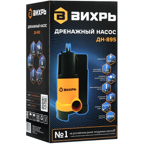 Дренажный насос Вихрь ДН-895 поможет перекачать воду из затопленного помещения, подвала или погреба. Насос может работать с загрязненной жидкостью. Максимальный диаметр твердых включений в жидкости не должен превышать 35 мм. Насос способен перемещать до 258 литров жидкости в минуту. Конструкцией предусмотрен внутренний поплавковый механизм.