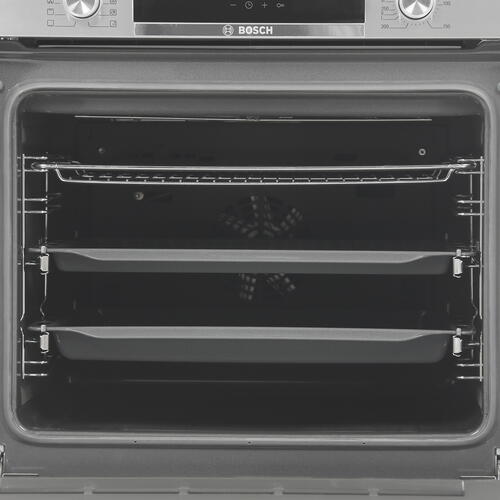 Электрический духовой шкаф Bosch HBJ558YS0Q в черно-серебристом корпусе предназначен для независимой установки. Это значит, что разместить его можно отдельно от варочной поверхности. За счет камеры объемом 66 л внутри можно разместить большие блюда. Модель принадлежит классу энергоэффективности А, что указывает на ее экономичность. Дисплей, часы и таймер гарантируют простоту управления и то, что вам не придется неотлучно стоять у духового шкафа и контролировать процесс выпечки. Модель с 10 автоматическими программами работы позволяет создать подходящие условия для приготовления любых блюд, от легких бисквитов до хорошо прожаренного мяса на гриле. Блокировка от детей гарантирует безопасность использования электрического духового шкафа Bosch HBJ558YS0Q наряду с опцией защитного отключения при перегреве. Поддоны и посуда устанавливаются внутри на телескопические направляющие. Каталитическая очистка – еще одно значительное достоинство модели. Все загрязнения буквально сгорят в огне, а вам останется только провести по поверхностям влажной салфеткой.