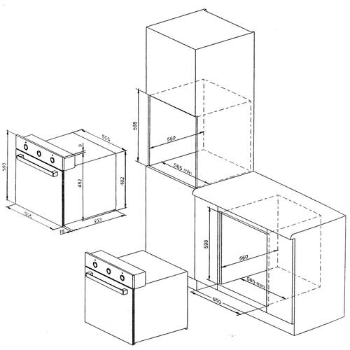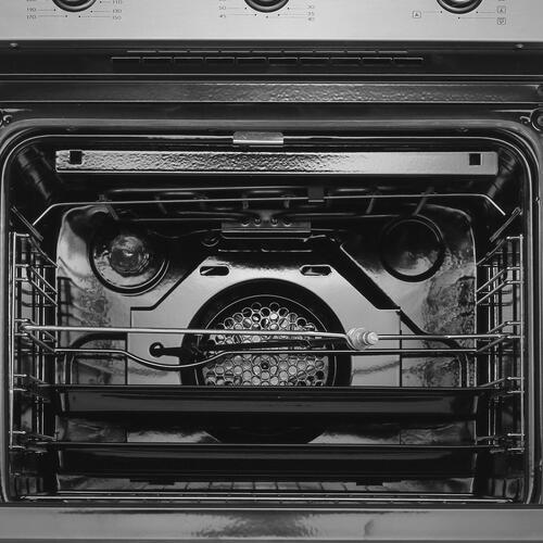 Объем духового шкафа – 60л. Духовой шкаф имеет 9 режимов работы, оборудован терморегулятором, конвектором и электрическим грилем. Благодаря решетчатым направляющим, возможно, разместить несколько противней одновременно. В комплекте с духовым шкафом прилагается решётка и набор из двух эмалированных поддонов.