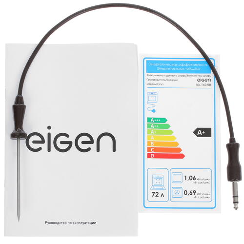 Электрический духовой шкаф Eigen BO-TK721B выключается в обозначенный пользователем временной интервал. Достаточно воспользоваться программируемым таймером. Термощуп помогает с определением готовности пищи. Телескопические направляющие помогают установить и вынуть противни. Очистка паром расщепляет сложные пятна и облегчает уход за устройством. Лампа освещения позволяет контролировать течение кулинарного процесса.