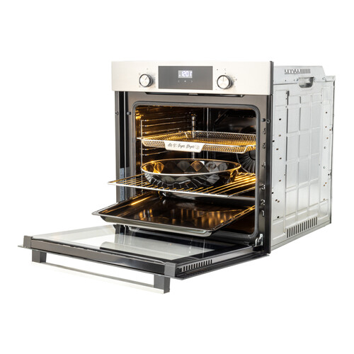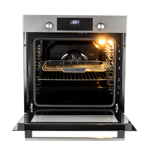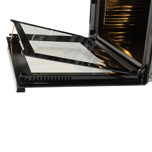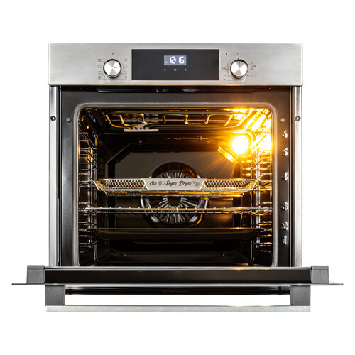 Внутри — эмаль лёгкой очистки и опция паровой очистки, что значительно облегчает уход после приготовления сложных блюд. Два стекла в дверце сохраняют внешние поверхности от перегрева, а фронтальное освещение позволяет контролировать степень готовности без открытия дверцы.