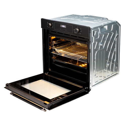 Тройное стекло дверцы поддерживает стабильную температуру внутри, а внешние поверхности остаются относительно прохладными. При мощности 2300 Вт духовка разогревается достаточно быстро. В комплекте вы найдёте 2 противня и решётку WellFry, что расширит кулинарные возможности — от выпечки печенья до запекания овощей и жарки на решётке.