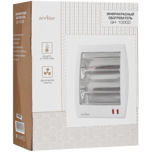 Aceline QH-1000D поддерживает напольную установку, совершенно безопасен для пользователей, поскольку закрывает решеткой нагревающиеся элементы. Такой прибор быстро нагреет детскую комнату или спальню благодаря кварцевому элементу, позволяя просыпаться в теплом помещении, ощущая только комфорт. Он поддерживает два режима нагрева. Для подключения обогревателя к сети используется кабель длиной 1.25 м.