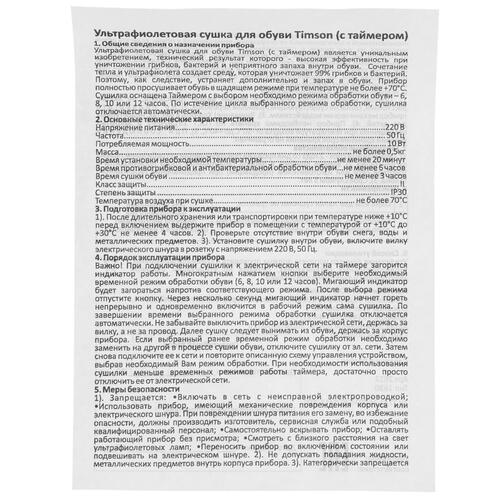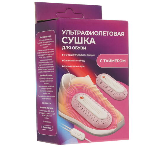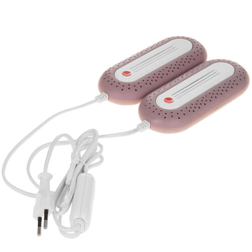 Электрическая сушилка Тимсон 2612 заключена в пластиковый корпус розового цвета, который легко очищается от загрязнений. Модель работает путем подключения 1.37-метрового кабеля к сети. Время сушки одной пары обуви занимает не менее 3 ч.