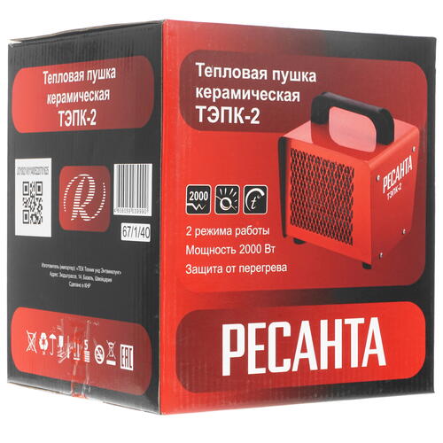 Тепловая пушка Ресанта ТЭПК-2 выполнена в прямоугольном корпусе с ручкой, что позволяет удобно транспортировать ее и перемещать в нужное место. Внутри установлен керамический нагревательный элемент, который отличается равномерным распределением тепла без пересушивания воздуха. Данный прибор предназначен в качестве источника основного или дополнительного обогрева различных помещений. Поворотные переключатели позволяют выбирать один из двух режимов мощности нагрева и интенсивность. Для повышения безопасности в Ресанта ТЭПК-2 реализована технология защиты от перегрева.