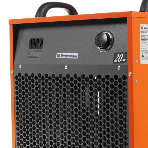 Тепловая пушка электрическая Тепломаш КЭВ-20Т20Е – простой в эксплуатации и мощный прибор, способный работать в режиме полноценного обогрева или простой вентиляции. Система оснащена двумя ступенями переключения мощности на 10 и 20 кВт, благодаря чему достигает производительности 2500 м3/ч. В основе оборудования используется мощный ТЭН, управление которым обеспечивается благодаря регулируемому термостату.