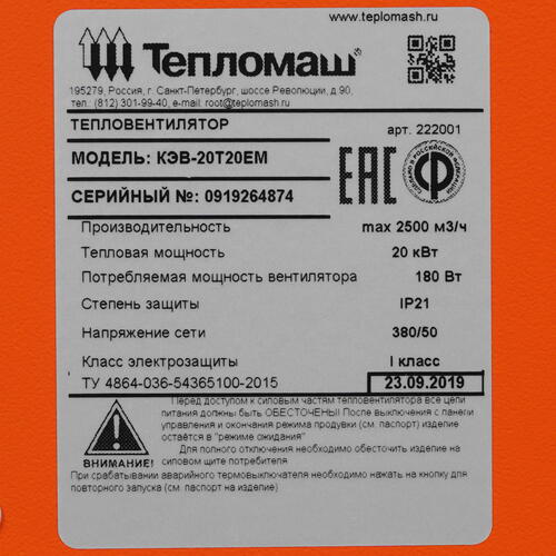 Тепловая пушка электрическая Тепломаш КЭВ-20Т20Е [7998588]