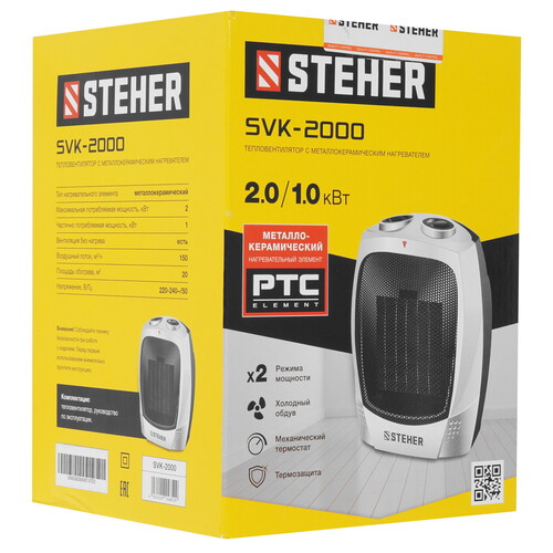 Тепловентилятор STEHER SVK-2000 оборудован металлокерамическим нагревательным элементом, который не сушит воздух в помещении. Производительность модели рассчитана на обслуживание площади до 20 м². Выбор ступени мощности служит для уменьшения расходов на электричество.