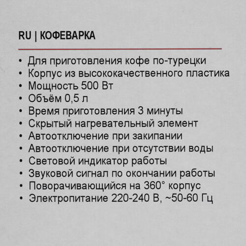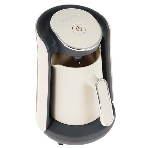 Электрическая турка BRAYER BR1142 мощностью 500 Вт способна сварить вкусный и ароматный напиток за 3 мин. Окончание приготовления знаменуется звуковым сигналом. Встроенный в корпус турки датчик автоматически отключает ее при нагреве воды до 98°. Поэтому закипевший кофе не убежит. В дно чаши турки встроен скрытый нагревательный элемент, благодаря чему ее будет удобно мыть после использования. Для подключения к электросети турка оснащена кабелем. Защита от включения без воды обеспечивает безопасную эксплуатацию электрической турки.