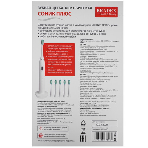 Электрическая зубная щетка BRADEX Соник Плюс белый [9193336]