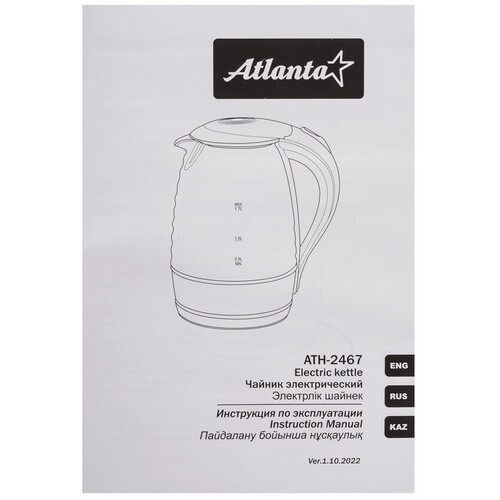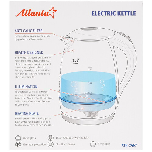 Корпус чайника Atlanta ATH-2467 изготовлен из термостойкого стекла. У прибора специальная ручка предотвращающая скольжение. Модель объемом 1.7 л обеспечивает быстрое закипание.