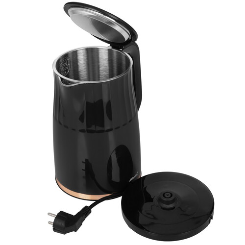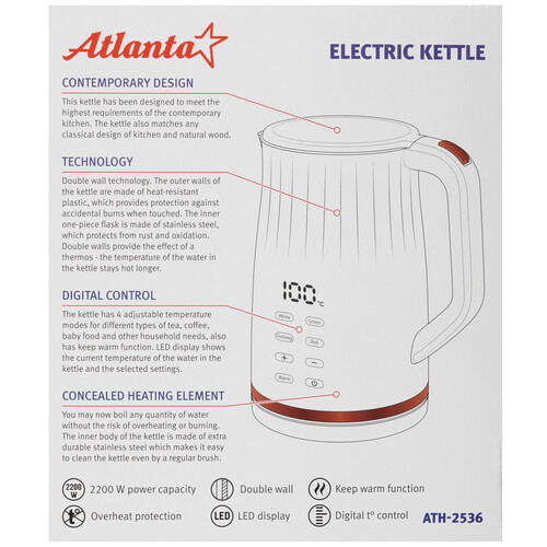 Двойные стенки корпуса обеспечивают высокую термоизоляцию. Внутренняя колба выполнена из высококачественной нержавеющей стали. Внешние стенки из качественного пластика, что гарантирует безопасность использования. Функция поддержания температуры: в течение 2-х часов чайник поддерживает температуру воды, после этого отключится, и вода станет комнатной температуры.