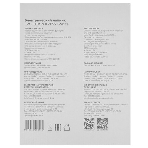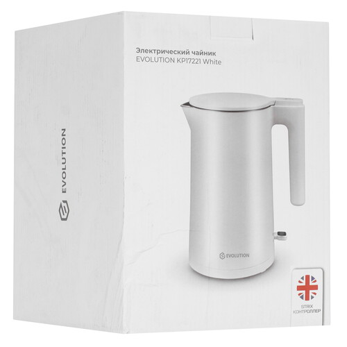 Электрический чайник Evolution KP17221 оснащен изолирующей системой тепла, предотвращающей нагревание внешней стороны, при этом сохраняя тепло внутри. Внутренняя колба выполнена из нержавеющей стали SUS304, что обеспечивает отсутствие посторонних запахов и примесей. Внешний корпус изготовлен из безопасного, ударопрочного ABS-пластика. Чайник безопасен в использовании и имеет четыре функции контроля: автоматическое отключение после закипания воды, при перегреве, при отсутствии воды в баке и при снятии чайника с основания.