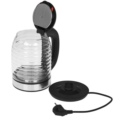Легкий и прочный стеклянный чайник с голубой внутренней подсветкой в стильном прозрачном корпусе из закаленного стекла.