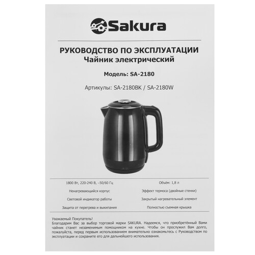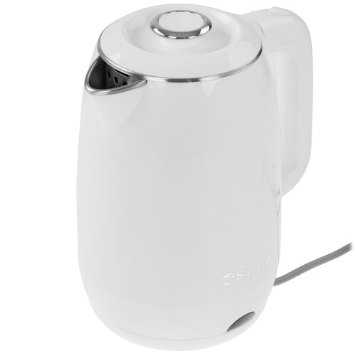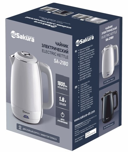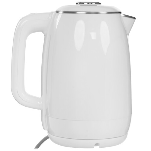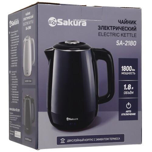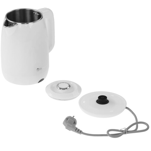 Чайник электрический, 1.8л, 1800Вт, дисковый нагревательный элемент, ненагревающийся двухслойный корпус, эффект термоса (быстрее нагревается и дольше удерживает тепло), полностью сьемная крышка, отключение при закипании/без воды, световой индикатор работы, внутренний индикатор уровня воды, вращение на 360°. Длина шнура 0,75м.