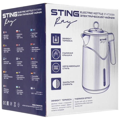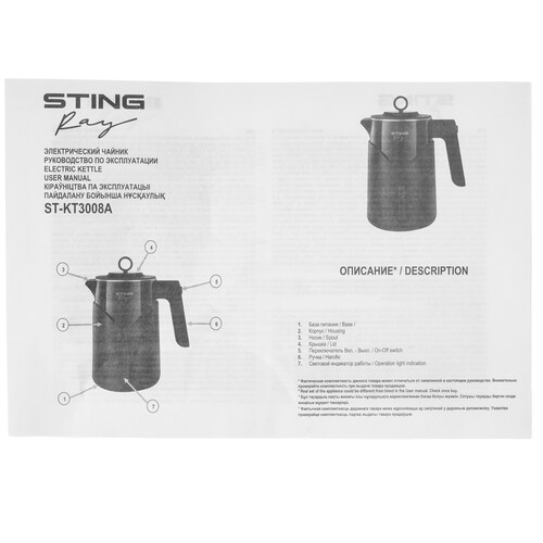 Stingray ST-KT3008A нагревает воду до температуры 100 °C. По окончании работы срабатывает система автоматического выключения. При недостатке воды в емкости активируется защитная технология, которая блокирует включение прибора. Узнать объем оставшейся воды можно с помощью мерной шкалы. Подключение к сети сопровождается использованием 0.6-метрового кабеля.