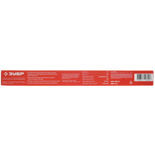 Электрод ЗУБР МР-3 имеет диаметр 4 мм, подходящий для подавляющего большинства сварочных аппаратов. Длина изделия составляет 450 мм. Масса электродов в комплекте – 1 кг.