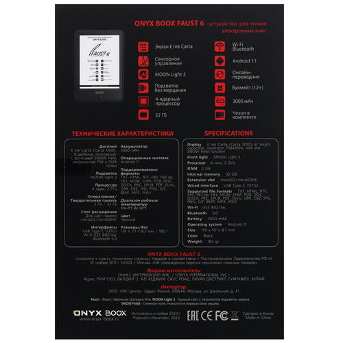 В электронной книге ONYX BOOX Faust 6 предусмотрен двухдиапазонный модуль Wi-Fi для выхода в сеть Интернет. Благодаря поддержке беспроводной технологии Bluetooth к устройству можно подключить наушники или колонки. Модель функционирует на базе операционной системы Android 11, которая позволит устанавливать на нее сторонние приложения. Ридер укомплектован обложкой для защиты экрана и корпуса от механических повреждений.