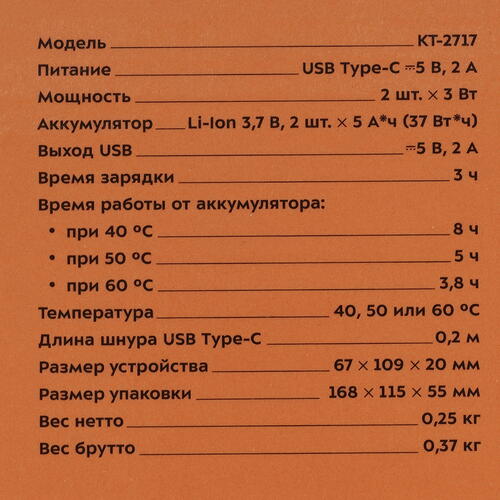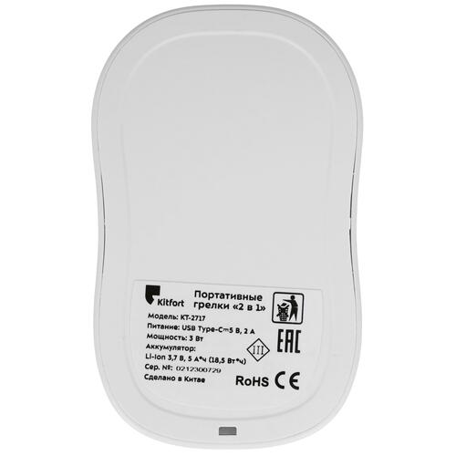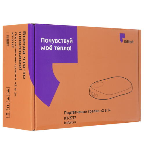 Портативные грелки «2 в 1» KT-2717 помогут согреть руки, ноги, прогреть обувь или одежду в холодное время года. Компактный размер грелок позволяет брать их с собой и использовать в любом удобном месте. Грелки для рук КТ-2717 могут работать как внешний аккумулятор (пауэрбанк) для зарядки сторонних устройств. На корпусе каждой грелки расположен разъём USB для зарядки устройств Выходной ток 2 А позволит быстро заряжать любые устройства.