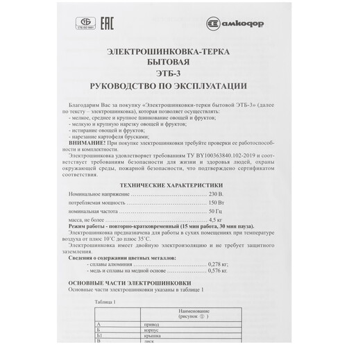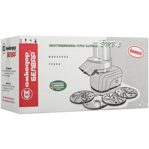 Электротерка Белвар ЭТБ-3 комплектуется толкателем, который защищает пальцы от соприкосновения с режущим механизмом. Комплект насадок служит для мелкой, средней, крупной шинковки, а также нарезки брусками. Выполненный из пластика корпус легко очищается от загрязнений.