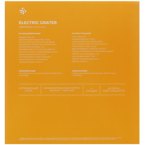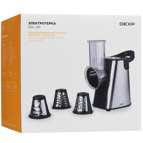 Электротерка DEXP DEG-200 заключена в корпус из металла и пластика, который легко очищается от загрязнений. Насадки из нержавеющей стали не утрачивают режущие характеристики и не покрываются коррозийным налетом. Время непрерывной работы рассчитано на 10 мин.