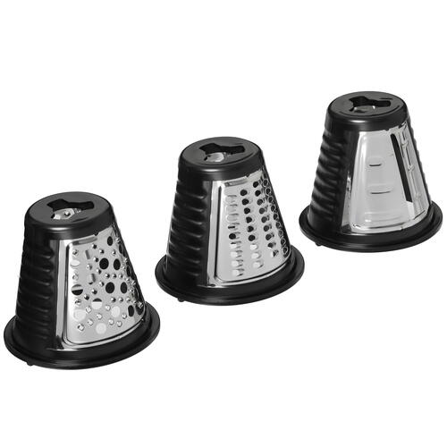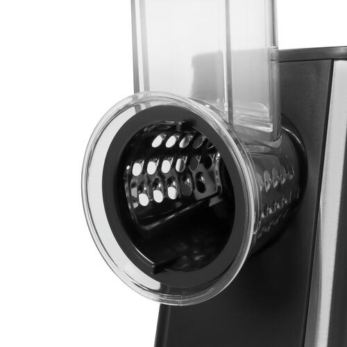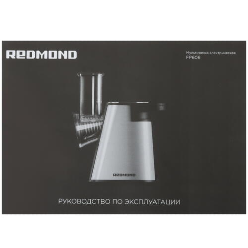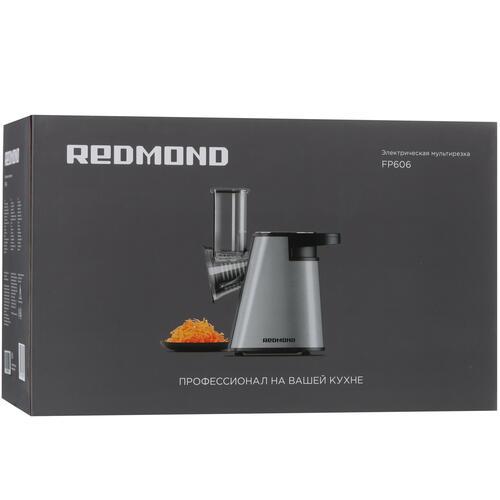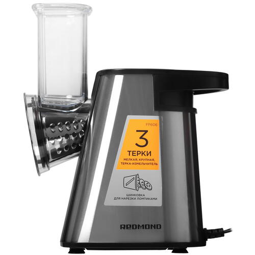 Электротерка Redmond FP606 с мощностью 400 Вт измельчает вареные и твердые продукты в больших объемах. После пяти минут непрерывной работы устройство требует отдыха. В комплекте есть крупная и мелкая терки, насадки для измельчения и шинковки.