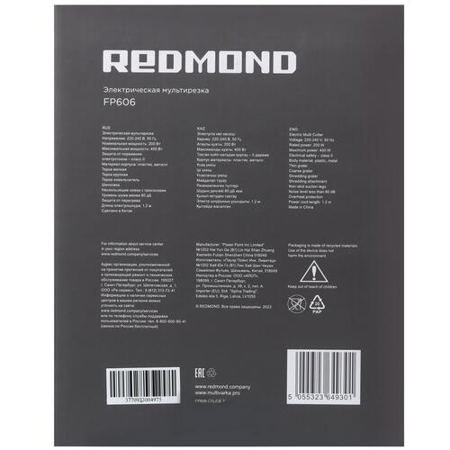 Прорезиненные ножки не дают Redmond FP606 вибрировать и скользить по столешнице. Длины кабеля 1.2 м хватает для подключения к розетке рядом со столом. Толкатель отвечает за безопасную подачу и создание давления на продукты для лучшего измельчения. Устройство с одной скоростью работы дополнено системой автоотключения при перегреве.
