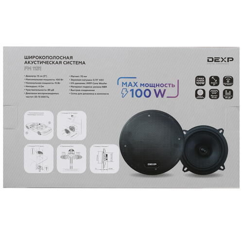 Динамики DEXP FM 1131 поставляются вместе с монтажным комплектом. Такое оборудование станет отличным дополнением для акустической системы грузового или легкового автомобиля. Динамики обладают диаметром по 13 см, монтажным отверстием 11.8 см и посадочной глубиной 4.6 см.