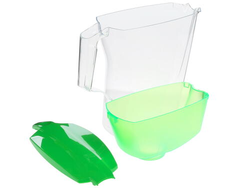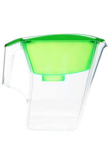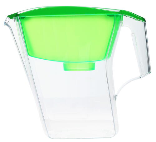 Объем кувшина составляет 2.8 литра. Он прозрачный, вы сможете быстро определить количество воды внутри. В кувшин устанавливается воронка зеленого цвета. Она наполняется жидкостью, которая в дальнейшем проходит через фильтр.