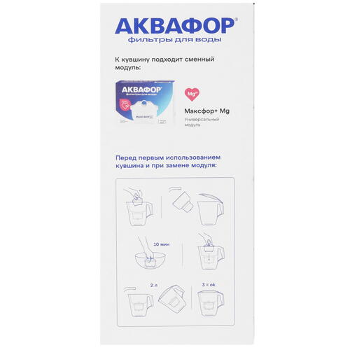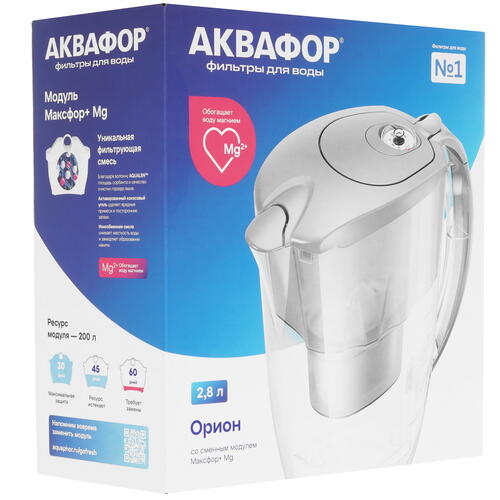 Аквафор Орион оснащен откидной крышкой для удобного наливания воды в воронку. Кувшин идет в комплекте со сменной кассетой Максфор+ Mg для проведения механической очистки и минерализации, задержки хлора и органических соединений, фенола, свинца и ржавчины, тяжелых металлов и неприятных запахов. Картридж гарантирует полноценную фильтрацию 200 л воды, после чего требует обязательной замены.