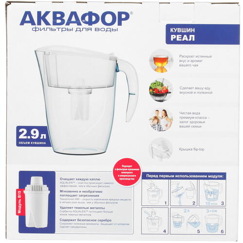 Фильтр-кувшин Аквафор Реал − удобное приспособление для очистки и хранения воды для дальнейшего ее употребления в пищу. Компактные размеры кувшина при его объеме 2.9 л позволяют хранить его в холодильнике, поставив на полку дверцы. Внутри кувшина установлена воронка объемом 1 л, в которой установлен фильтр и в которую вода изначально попадает для очистки. Кувшин изготовлен из пищевого пластика. Его можно мыть в посудомоечной машине.