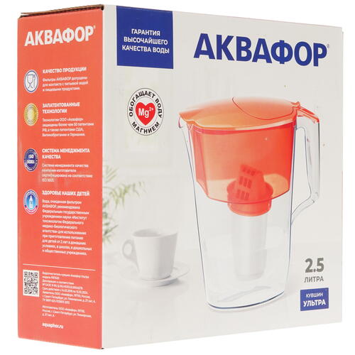 Фильтр-кувшин Аквафор Ультра А5 с оранжевым полупрозрачным корпусом оснащен широкой боковой ручкой и удобным носиком с небольшим наклоном. Предварительная фильтрация питьевой воды от примесей и механических частиц защитит чайник или кофеварку от накипи. Также фильтр-кувшин можно использовать для очистки уже кипяченой и охлажденной воды.