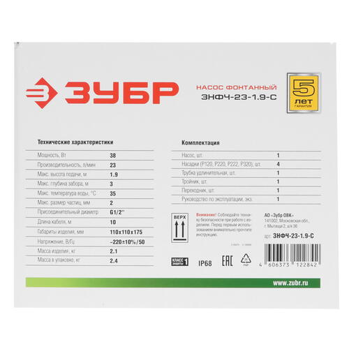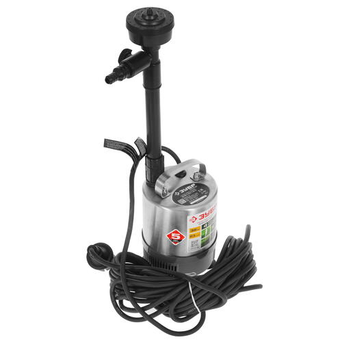 Устройство ЗУБР ЗНФЧ-23-1.9-C оснащено длинным кабелем 10 м, удлинительной трубкой и набором насадок. Допускается нагрев воды до 35°C и присутствие в жидкости твердых частиц диаметром менее 2 мм. Прибор подключается к трубопроводу через стандартную резьбу 1/2".