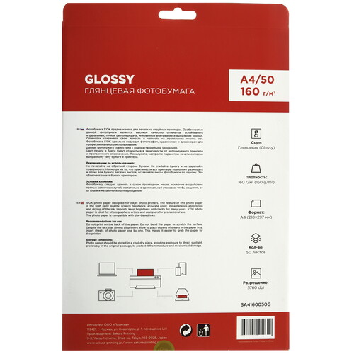 Благодаря глянцевому покрытию изображения на S'OK SA4160050G выглядят насыщенно и контрастно. Белая бумага не искажает передачу цвета при печати. Плотность 160 г/м² – оптимальный вариант для многих принтеров. Распечатанные на такой бумаге фотографии, листовки и брошюры устойчивы к прогибанию и случайным деформациям.