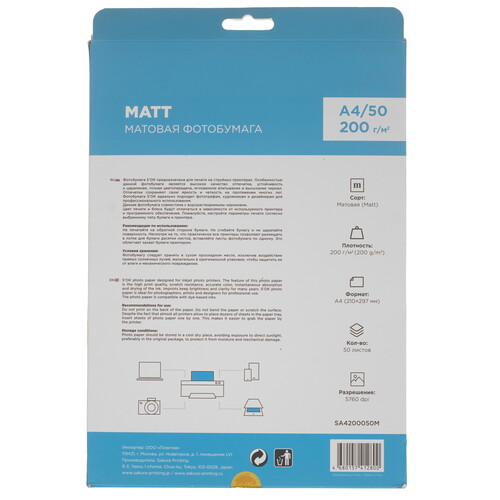 A4, 200 г/м², 50 л., покрытие - матовое, 5760 dpi